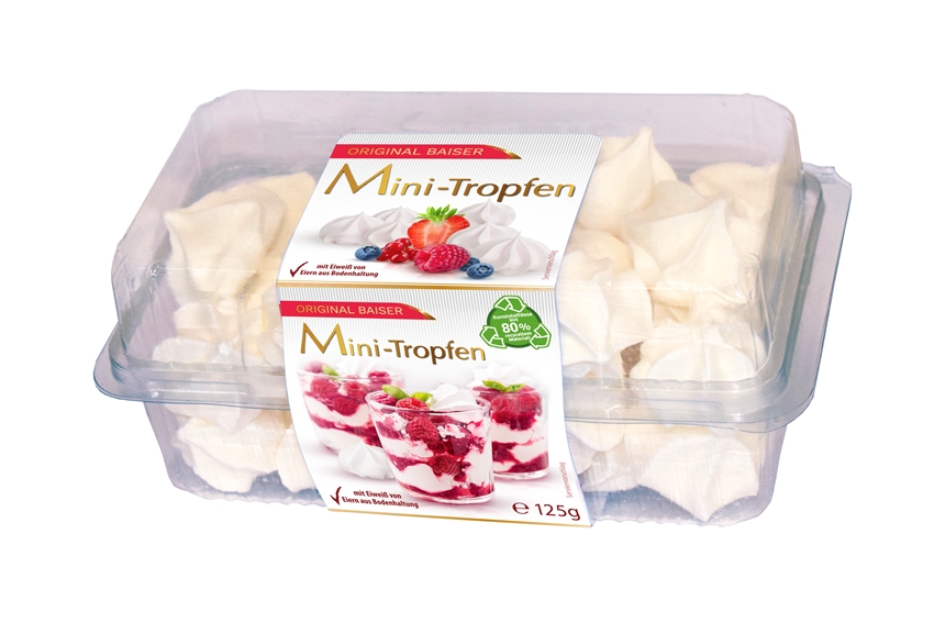 Ingredienzien/Zusammensetzung: Original Baiser - Mini Tropfen. Zutaten: Zucker, HÜHNEREIEIWEISS, Aroma. Mit Eiweiss von Eiern aus Bodenhaltung. Wärmegeschützt und trocken lagern. Hergestellt in Deutschland.